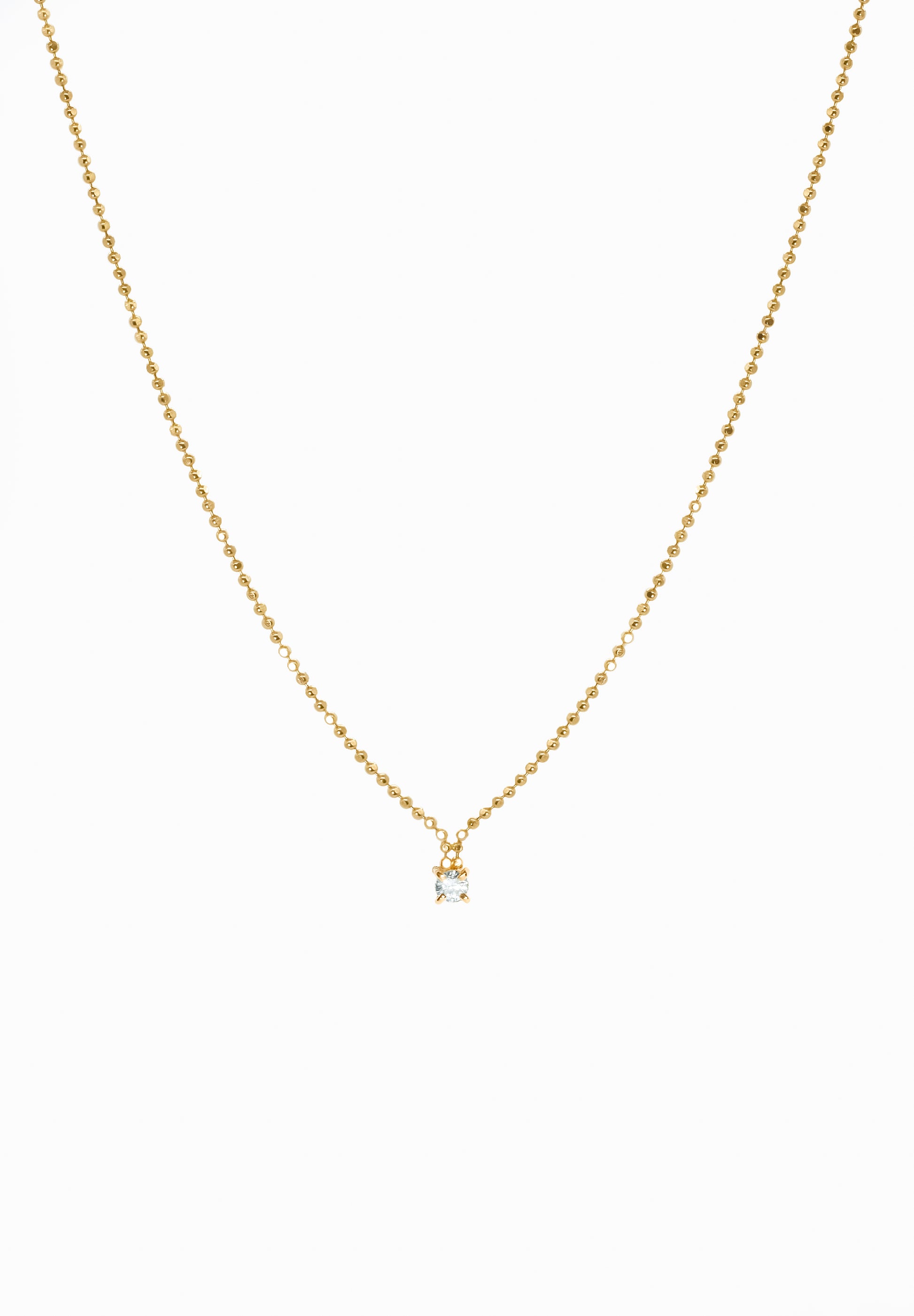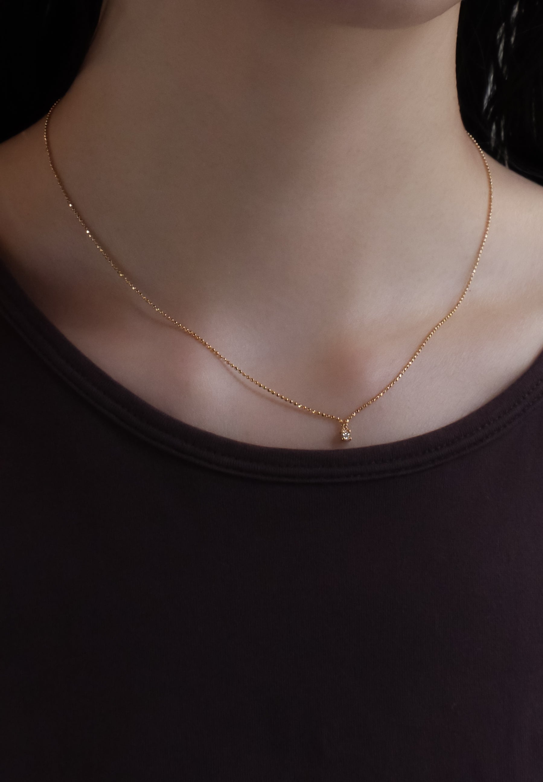 ClusterシリーズのDiamond Necklaceは極シンプルながら、チェーンがダイヤモンドに向かって細く流れる構造により華やかでありつつも繊細な優しい印象を与えます。
