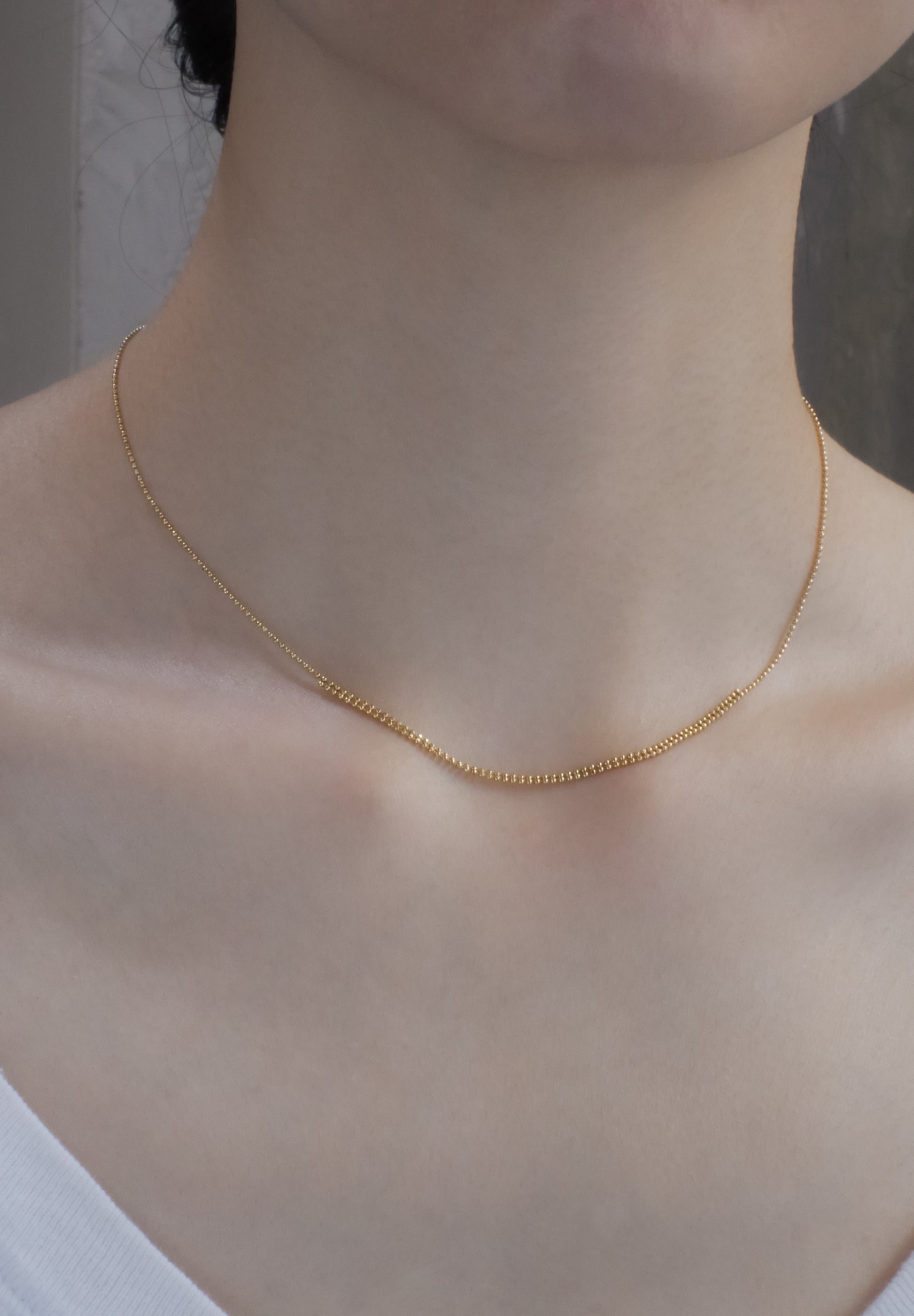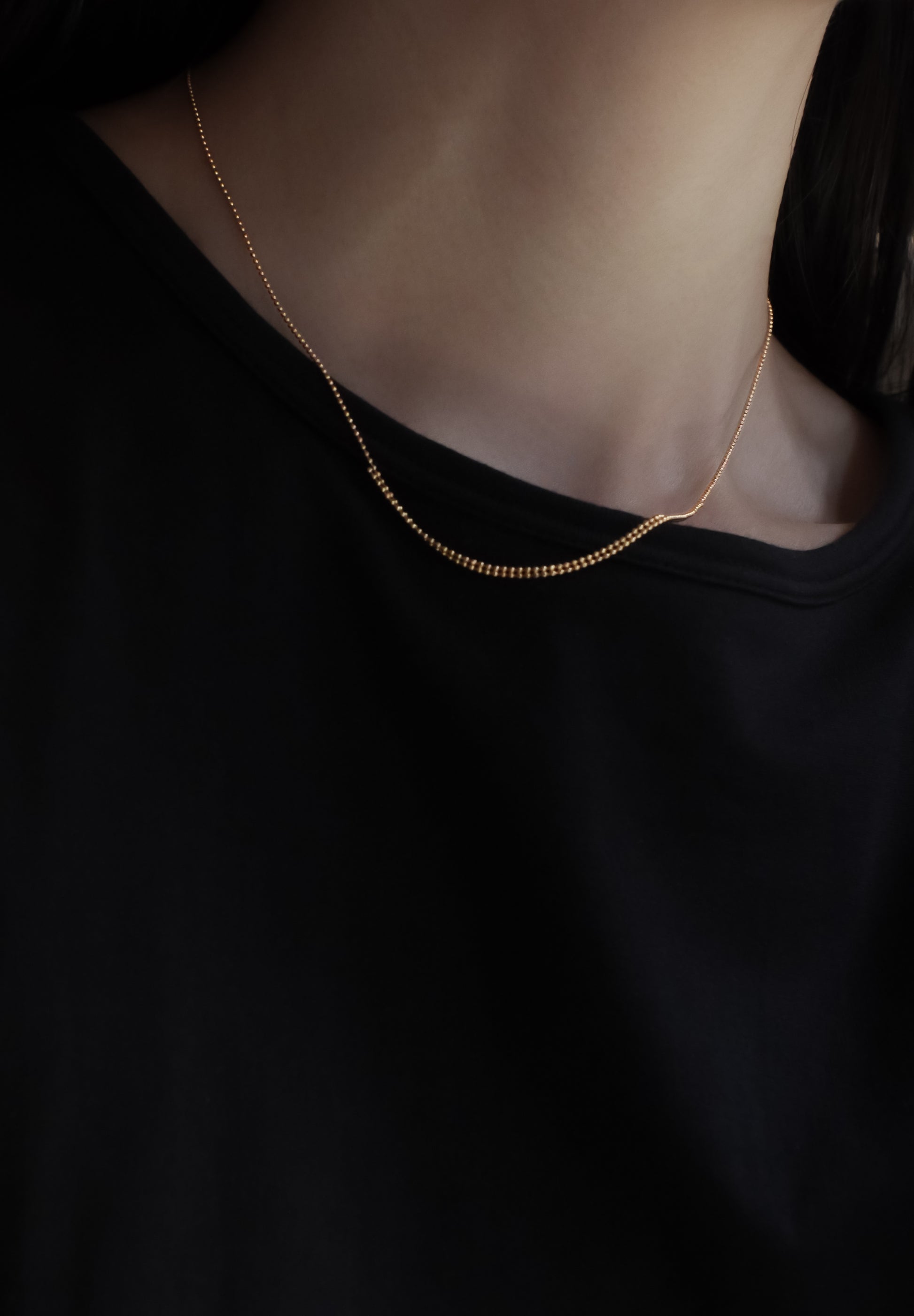 約1.0mmのボールカットチェーンが、房のように重なり、繋がり、美しいシルエットを形成しています。また、ボールチェーンを溶接し固める技術により、無駄を削ぎ落とした完全にミニマルなスタイルを実現させました。