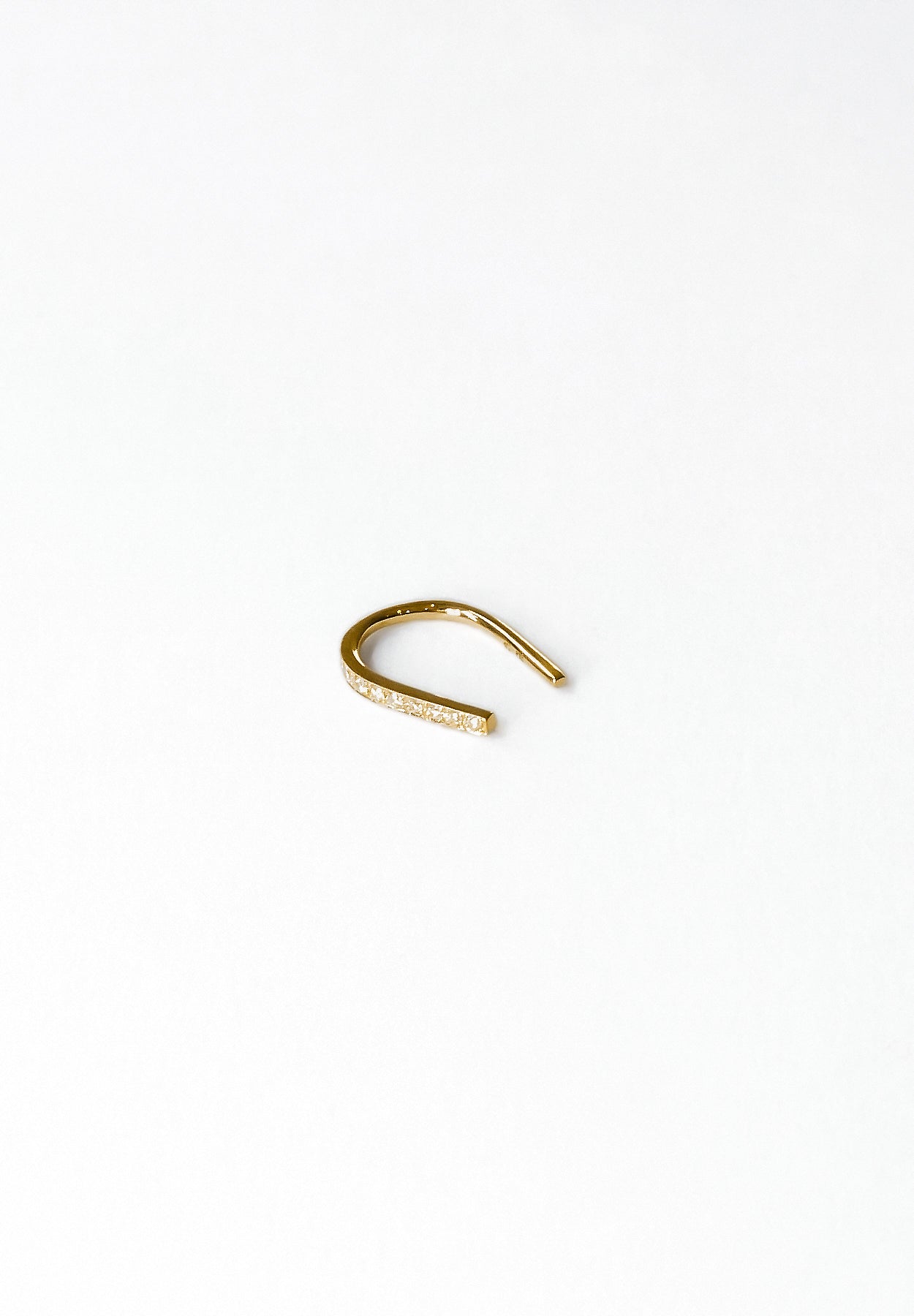 馬の蹄をモチーフにデザインされたピアス "Spartacus"の、装着時に正面に向く面に極小のダイヤモンドを据えたバージョン。馬蹄の堂々とした佇まいとシンプルで洗練されたシルエットは、耳たぶのピアスホールに通すだけで十分なホールド感を発揮します。K18とダイヤモンドのラグジュアリーな雰囲気をさりげなく演出できる究極にミニマルなアイテムです。