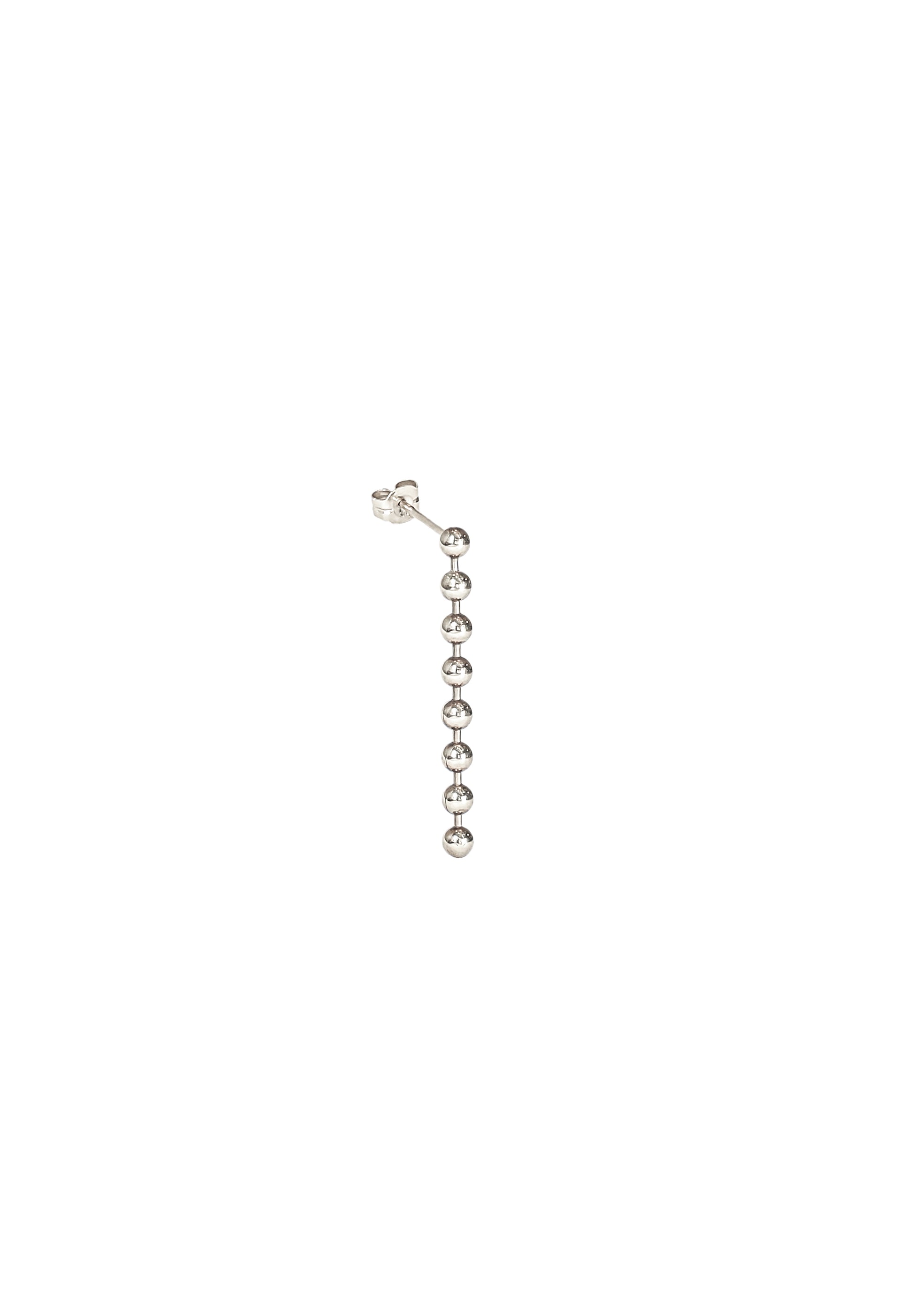 涙が落ちる様をジュエリーに落とし込んだデザイン、"ティア・ドロップ"。一コマは約3mm。3mmの球体の太いチェーンが耳から落ち、揺れる様子は、一般的なチェーンのそれよりも視覚的に明瞭なピアスです。