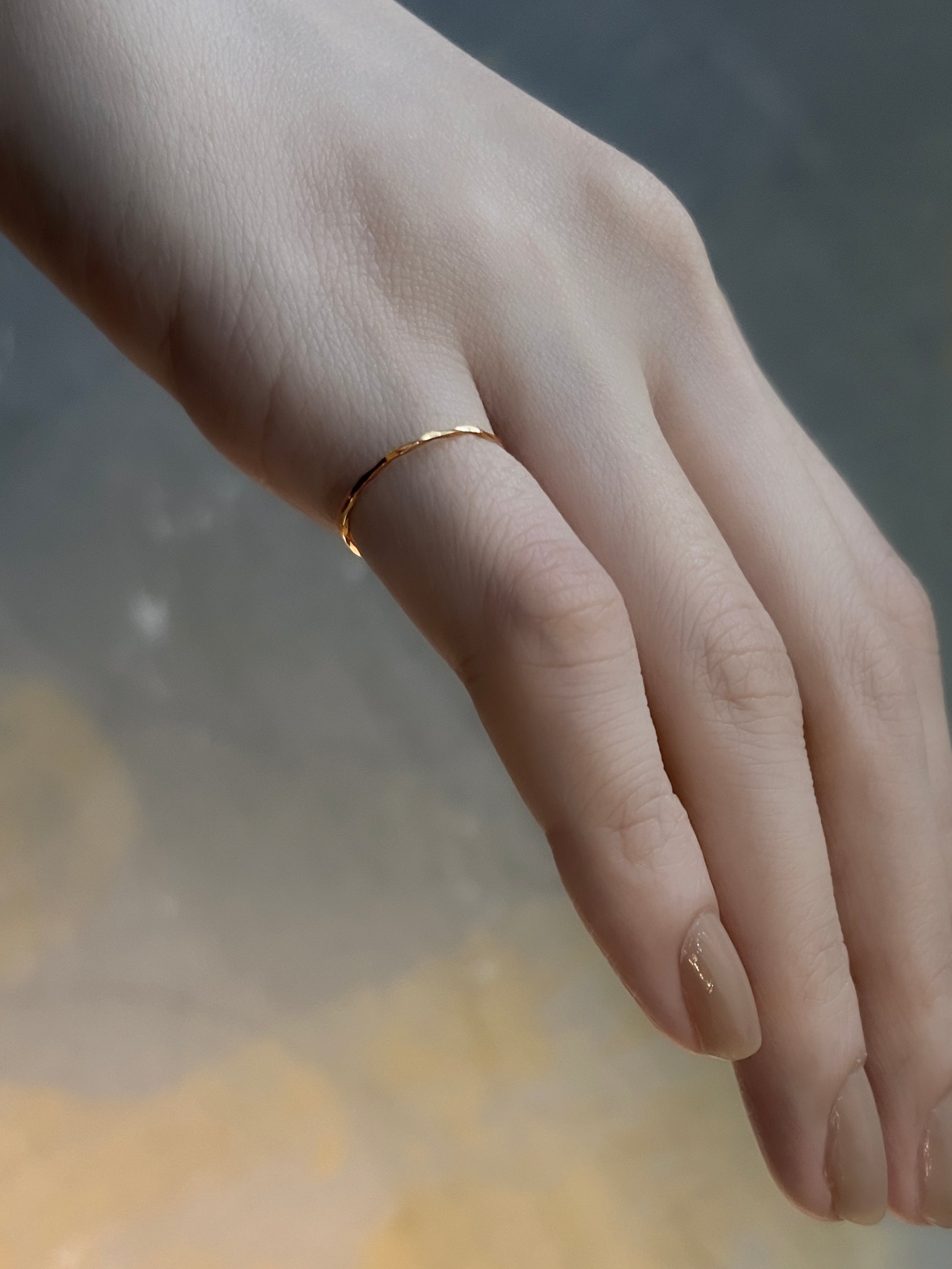 K18イエローゴールド製の0.8mm線で作られたリング、ピナ(Pina)。線がカットされ装飾が施されている。キラキラと光る華奢なシルエットはSOのアイテムの中でも最も繊細なリング。ミニマルな形はシャープな印象を与え、且つしっかりとゴールドの存在感も演出します。複数の指につけてゴールドのラインを作ってみたり、一本の指に重ねづけしたり、様々なコーディネートを楽しむことができます。