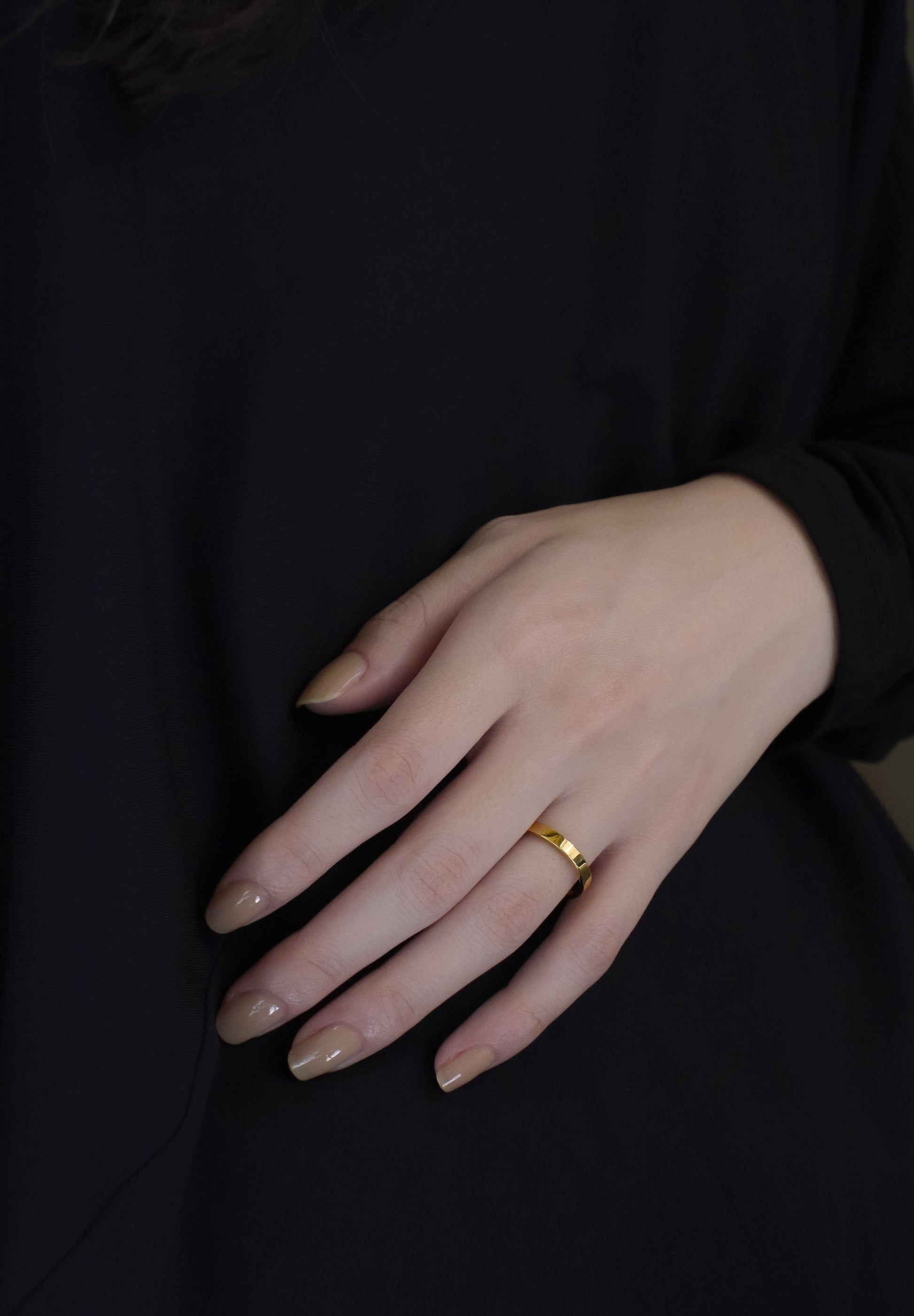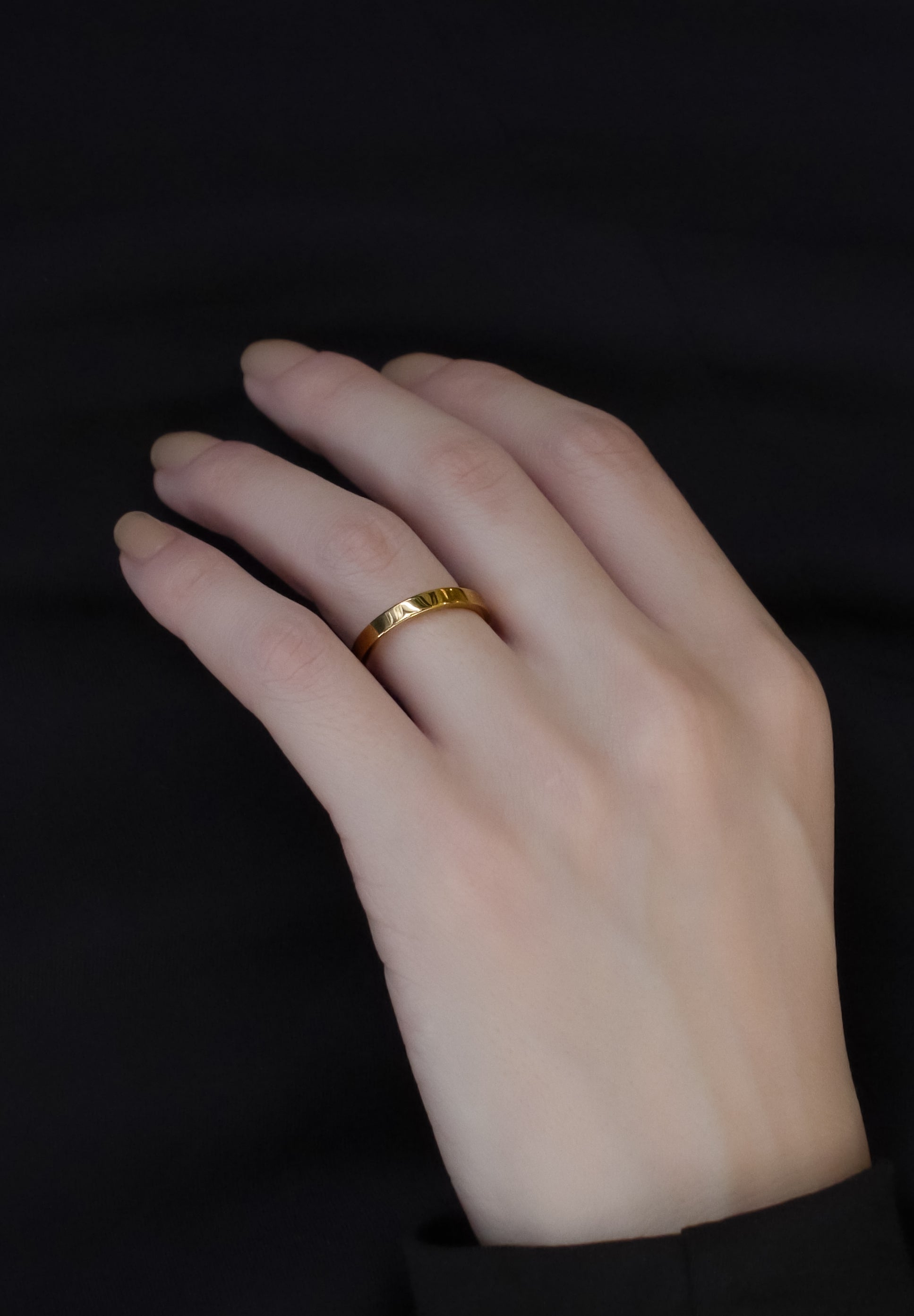 ウェディングリング対応のアイテム、HIDDEN PLACE(ヒドゥン・プレイス)。表側は曇り一つない美しいフラット面、内側は優しい丸みを帯びた驚くほど着け心地のよいリングです。落ち着きのある空気感の中にも、外側、内側のコントラストが美しいデザイン。