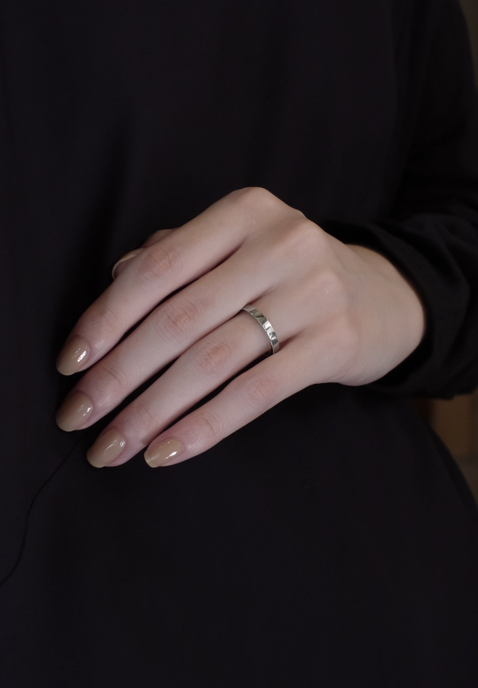 ウェディングリング対応のアイテム、HIDDEN PLACE(ヒドゥン・プレイス)。表側は曇り一つない美しいフラット面、内側は優しい丸みを帯びた驚くほど着け心地のよいリングです。落ち着きのある空気感の中にも、外側、内側のコントラストが美しいデザイン。