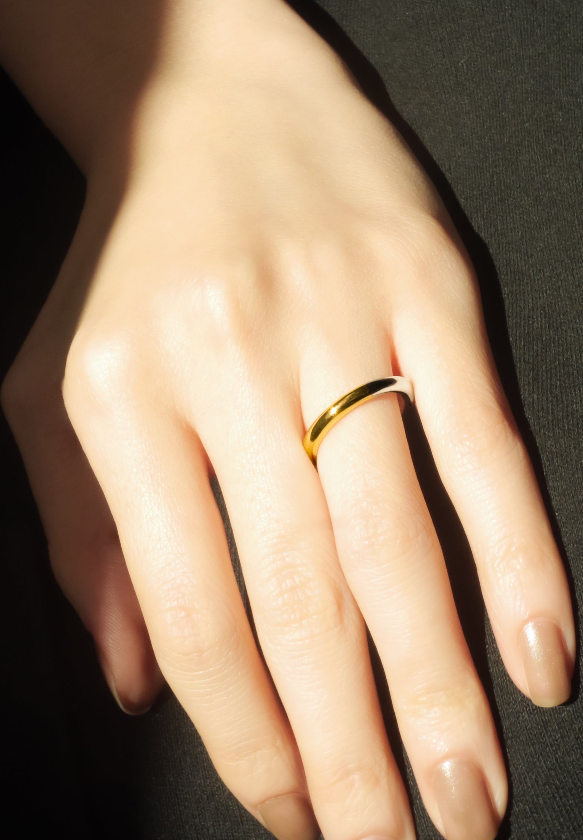 半分がプラチナ、もう半分がK18イエローゴールドのリング。丸線で構成された重厚感のあるシルエット。ペアリングとしてお選び頂くことが多く、お互い半分ずつ分け合うという意味が込められています。
