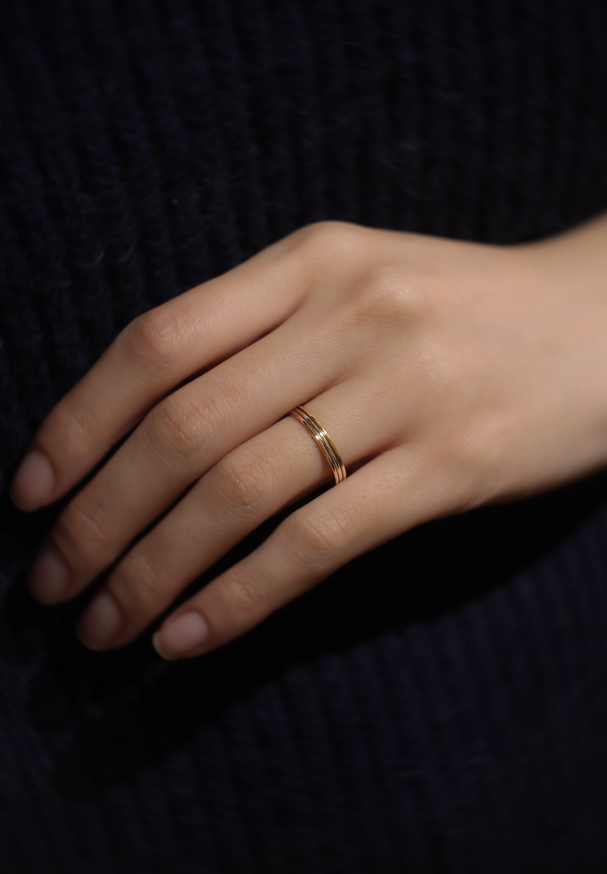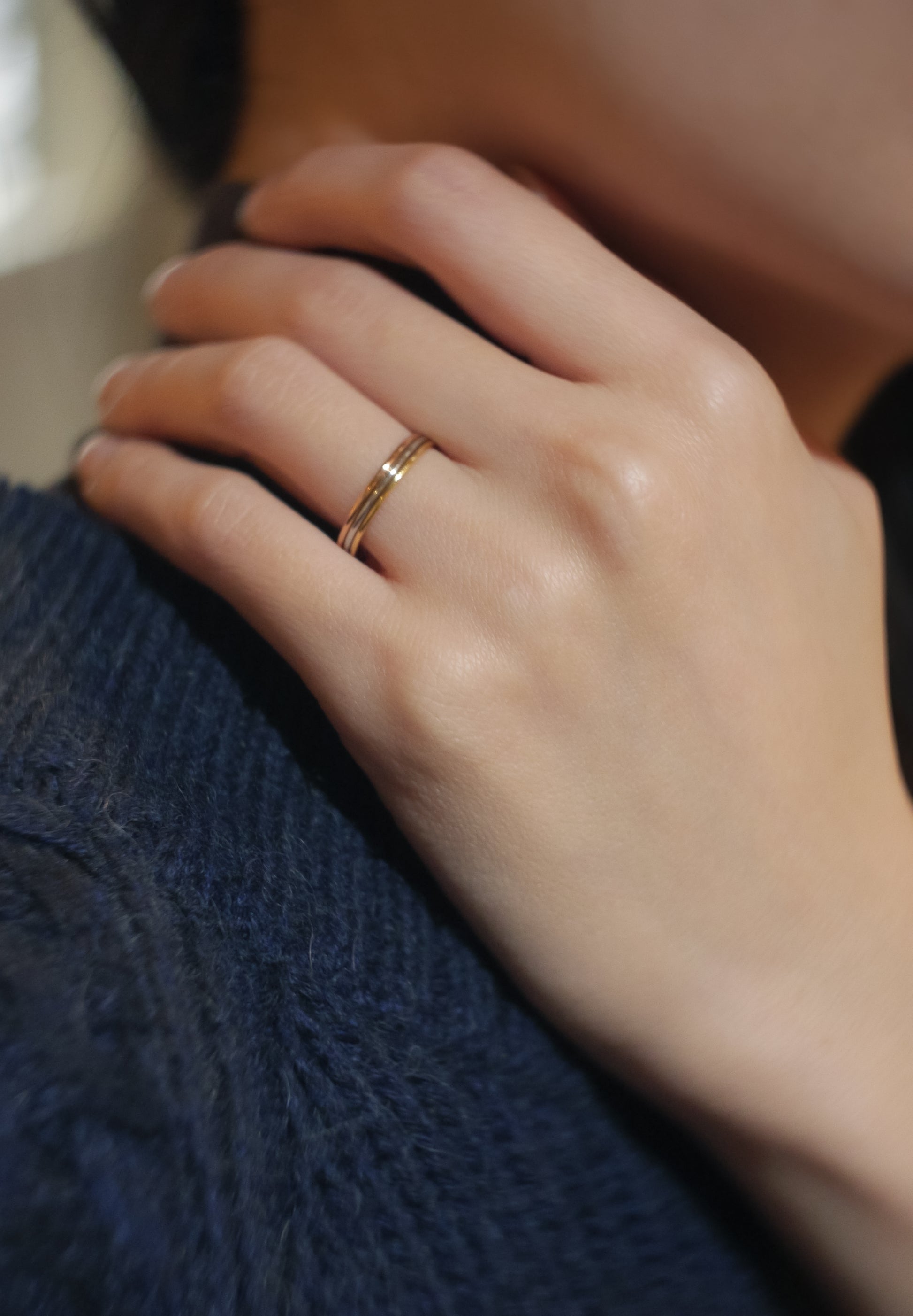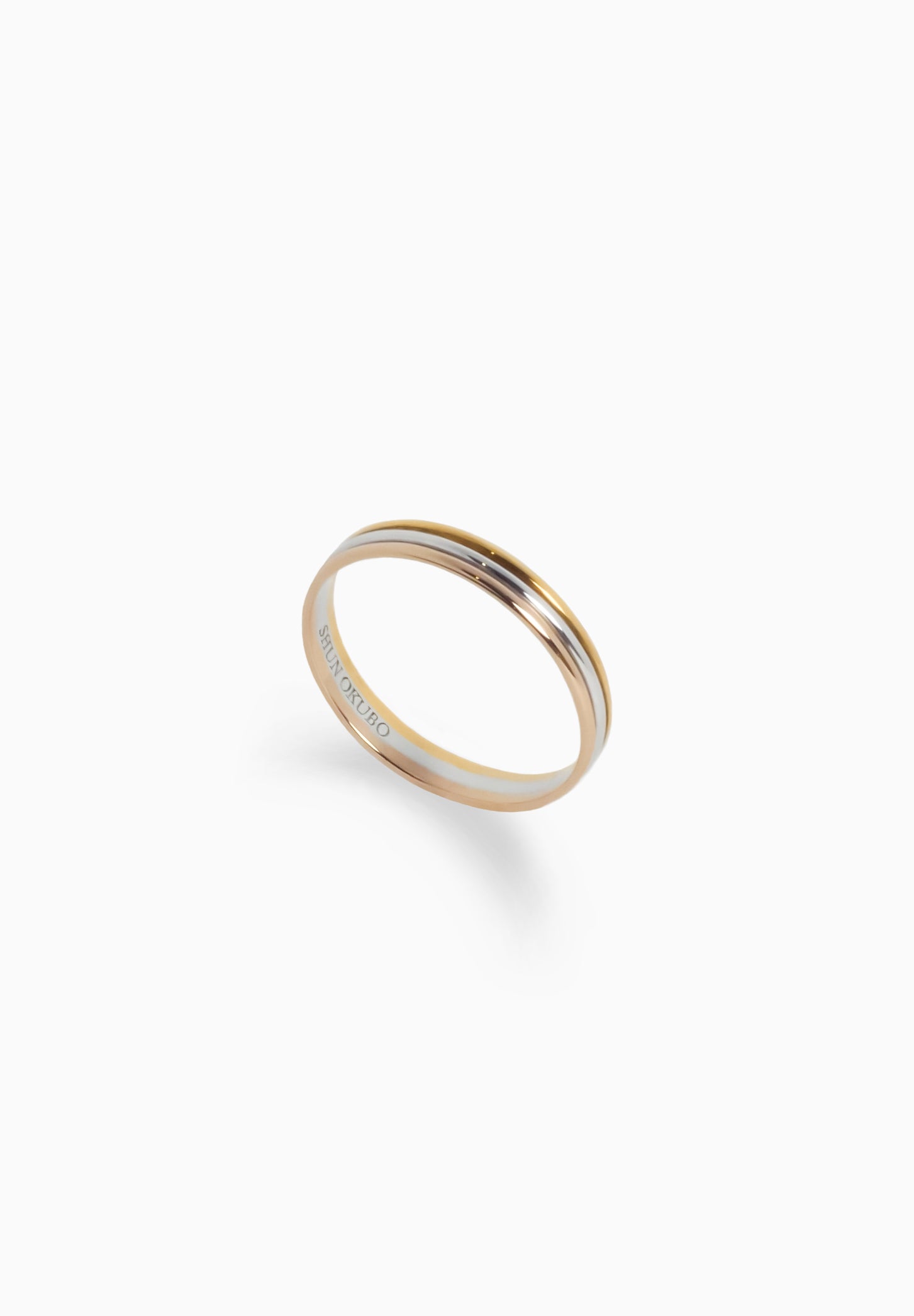 A ring featuring three layers of K18 yellow gold, K18 pink gold, and Pt900. SHUN OKUBO's highly skilled engineers meticulously crafted three distinct rings into one. The Trinity holds three meanings: pink gold symbolizes love, yellow gold represents loyalty, and platinum signifies friendship.